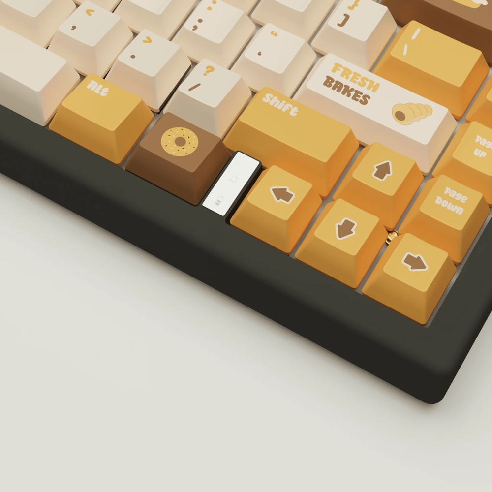 Bring the warmth and charm of a bakery-fresh morning to your workspace with goblintechkeys' Fresh Bakes Design Keycaps and Mechanical Keyboard. Inspired by the comforting essence of baked goods, this keyboard set blends cozy design with advanced technology for a unique and delightful typing experience.
